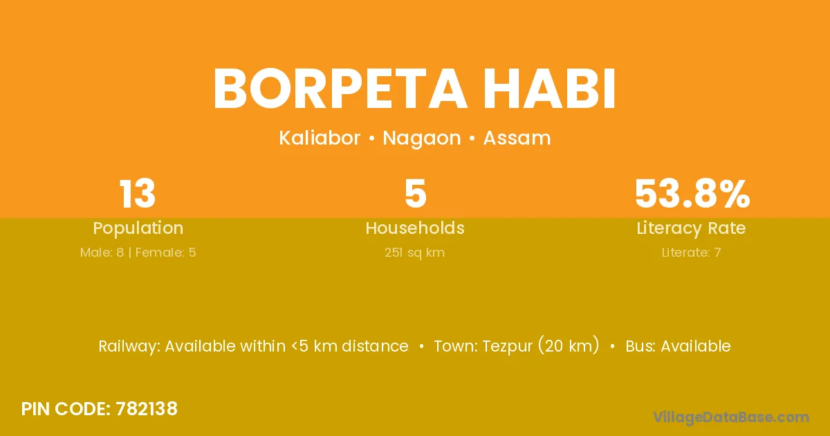 Tezpur (20 km) is the nearest town to Borpeta Habi village for major economic activities and is located approximately 20 km away.