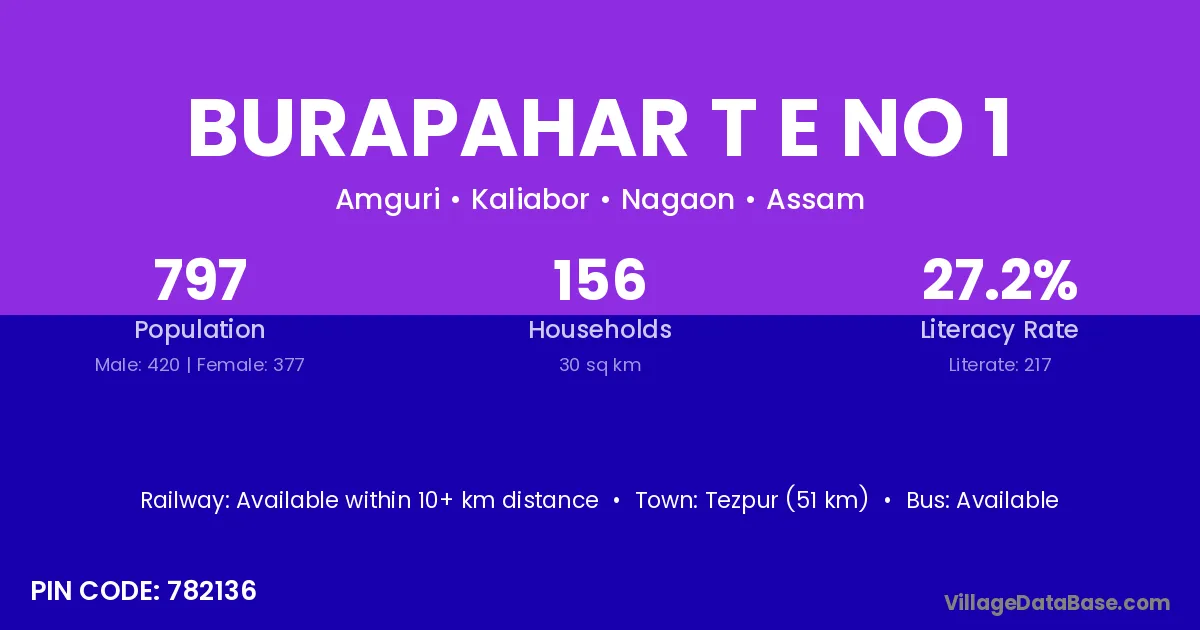 Tezpur (51 km) is the nearest town to Burapahar T E No 1 village for major economic activities and is located approximately 51 km away.