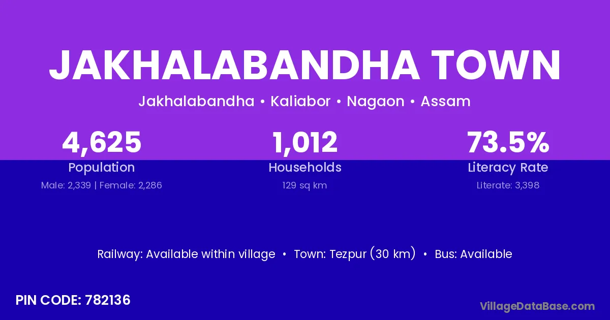 Tezpur (30 km) is the nearest town to Jakhalabandha Town village for major economic activities and is located approximately 30 km away.