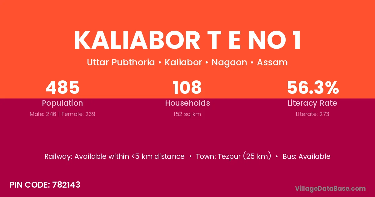 Kaliabor T E No 1 village has a total population of 485 people, of which 246 are males and 239 are females.