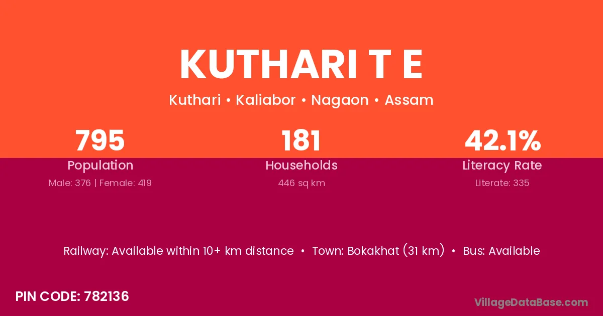 Bokakhat (31 km) is the nearest town to Kuthari T E village for major economic activities and is located approximately 31 km away.