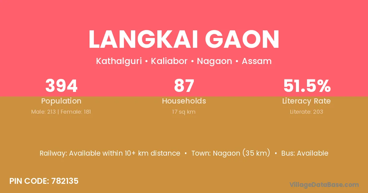 Nagaon (35 km) is the nearest town to Langkai Gaon village for major economic activities and is located approximately 35 km away.