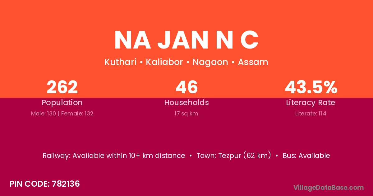 Tezpur (62 km) is the nearest town to Na Jan N C village for major economic activities and is located approximately 62 km away.