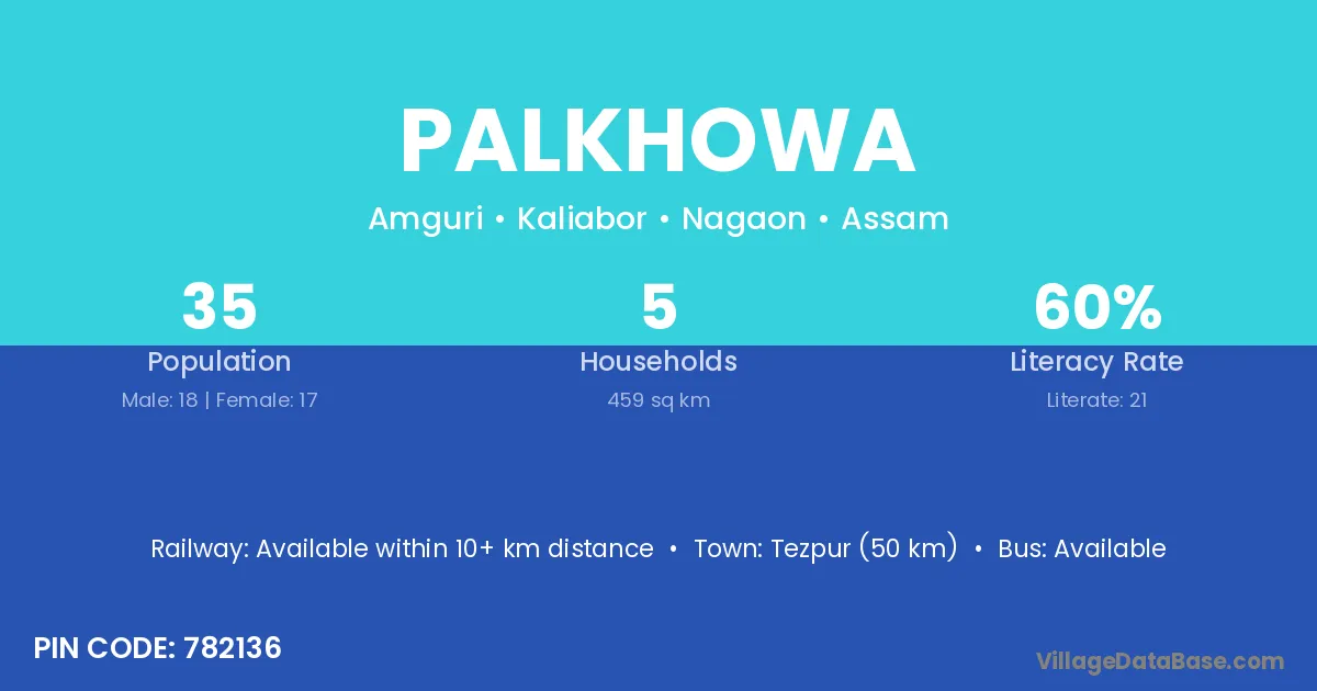 Tezpur (50 km) is the nearest town to Palkhowa village for major economic activities and is located approximately 50 km away.