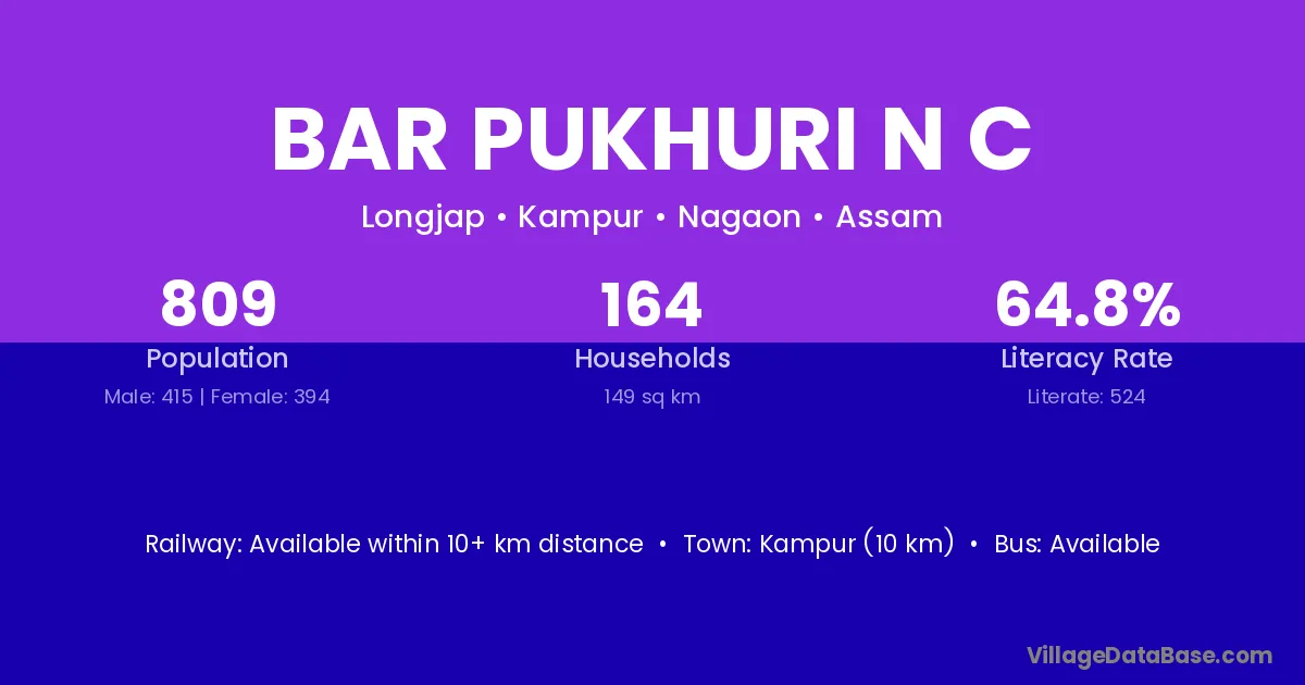 Bar Pukhuri N C village has a total population of 809 people, of which 415 are males and 394 are females.