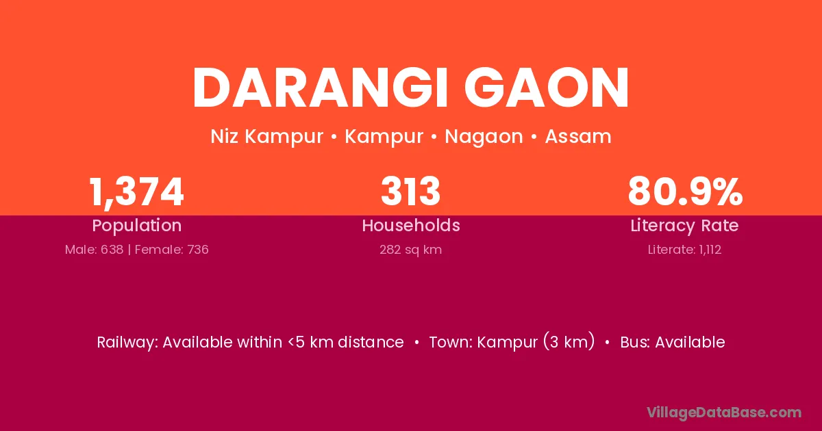 Kampur (3 km) is the nearest town to Darangi Gaon village for major economic activities and is located approximately 3 km away.