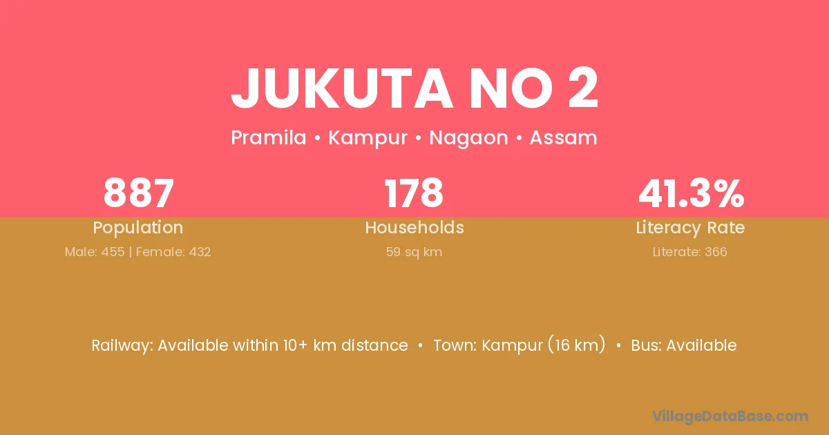 Jukuta No 2 village has a total population of 887 people, of which 455 are males and 432 are females.