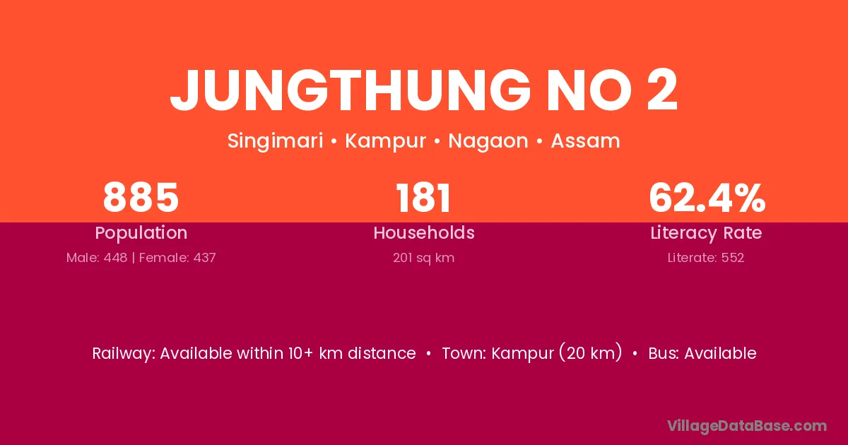 Jungthung No 2 village has a total population of 885 people, of which 448 are males and 437 are females.