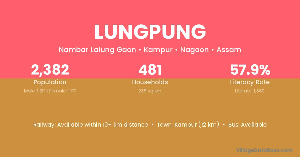 Kampur (12 km) is the nearest town to Lungpung village for major economic activities and is located approximately 12 km away.