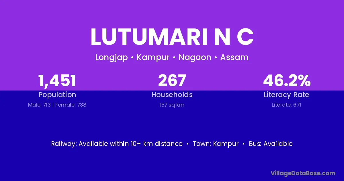 Lutumari N C village has a total population of 1,451 people, of which 713 are males and 738 are females.