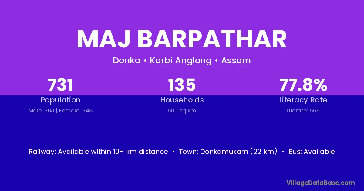 Kampur (30 km) is the nearest town to Maj Barpathar village for major economic activities and is located approximately 30 km away.