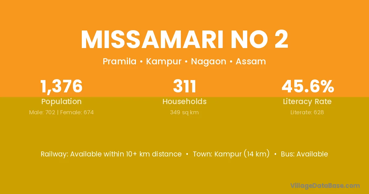 Missamari No 2 village has a total population of 1,376 people, of which 702 are males and 674 are females.