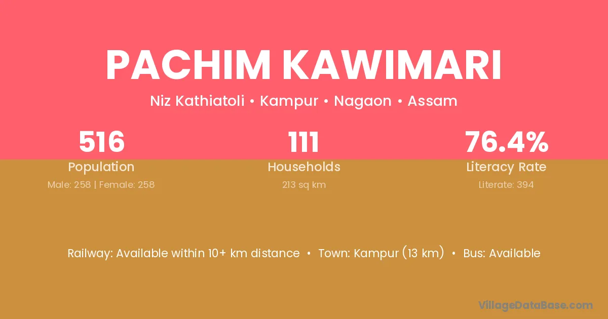 Kampur (13 km) is the nearest town to Pachim Kawimari village for major economic activities and is located approximately 13 km away.