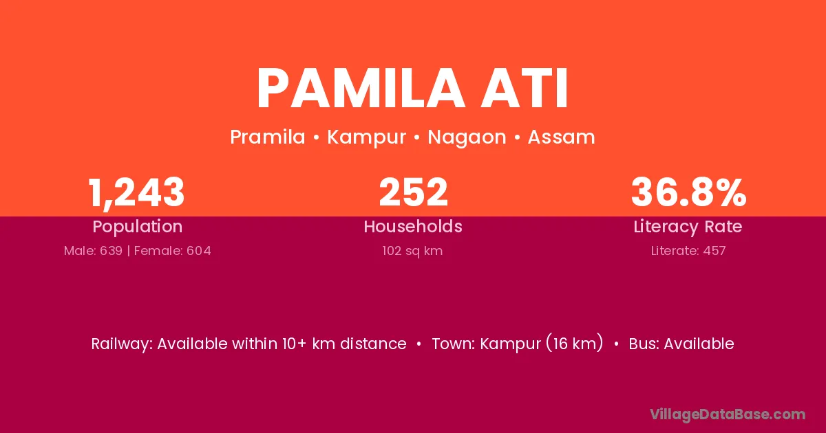 Kampur (16 km) is the nearest town to Pamila Ati village for major economic activities and is located approximately 16 km away.