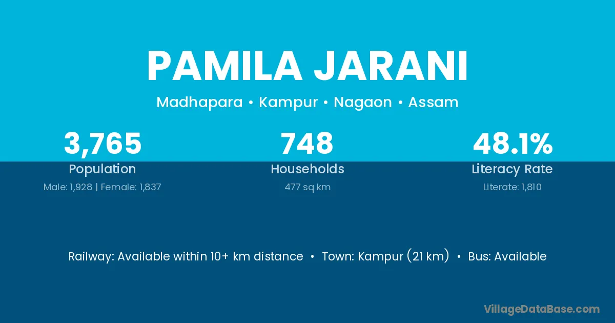 Kampur (21 km) is the nearest town to Pamila Jarani village for major economic activities and is located approximately 21 km away.