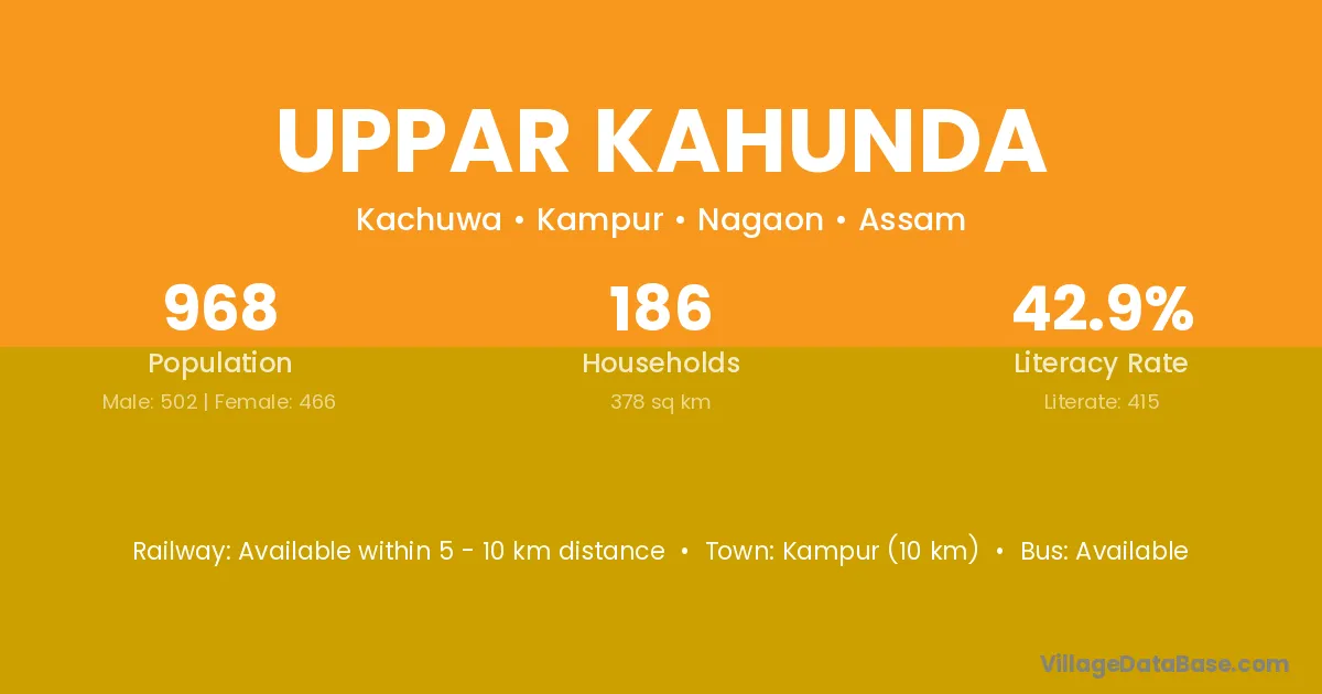 Kampur (10 km) is the nearest town to Uppar Kahunda village for major economic activities and is located approximately 10 km away.