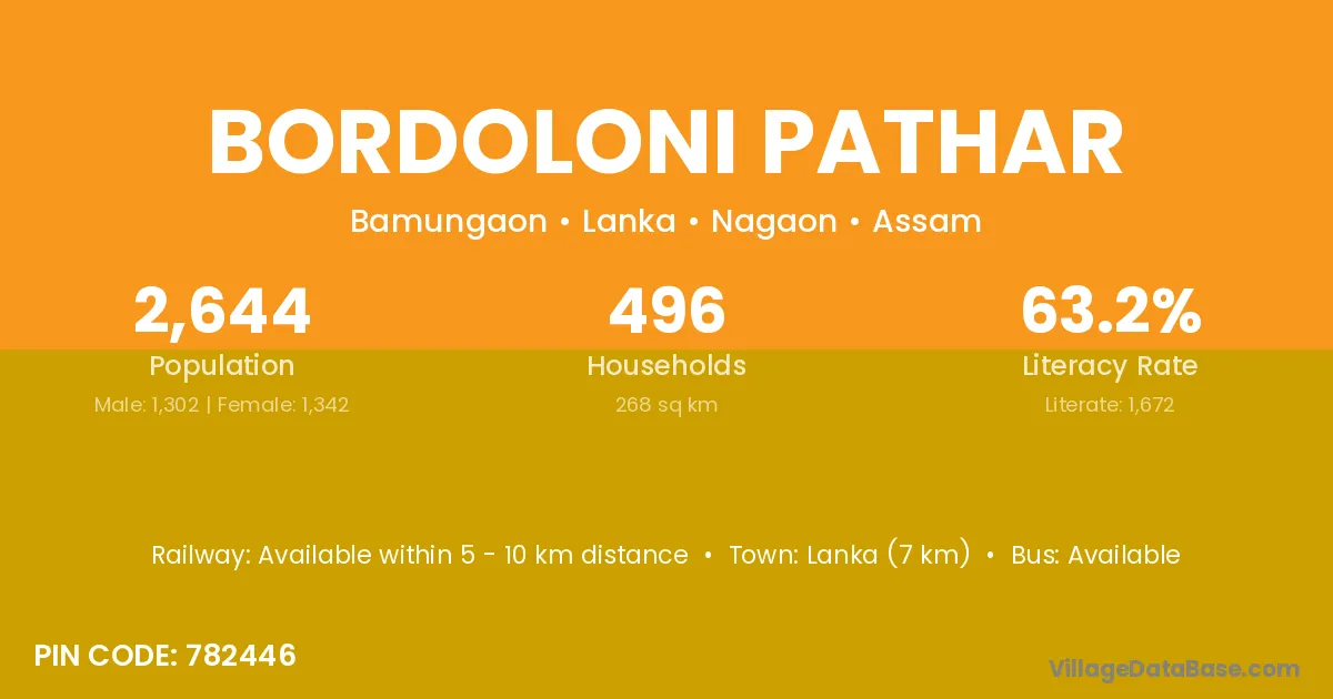 Lanka (7 km) is the nearest town to Bordoloni Pathar village for major economic activities and is located approximately 7 km away.
