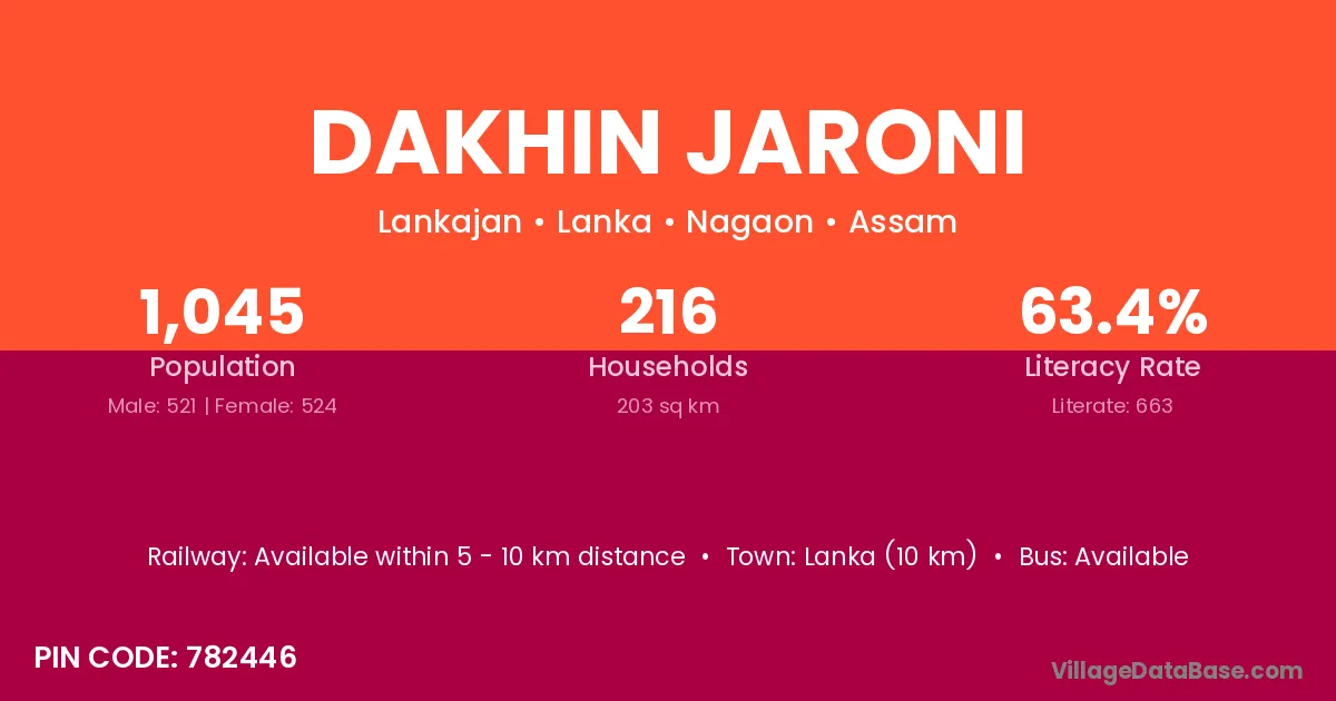 Dakhin Jaroni village is located in the Lanka Subdivision of the Nagaon district in Assam .