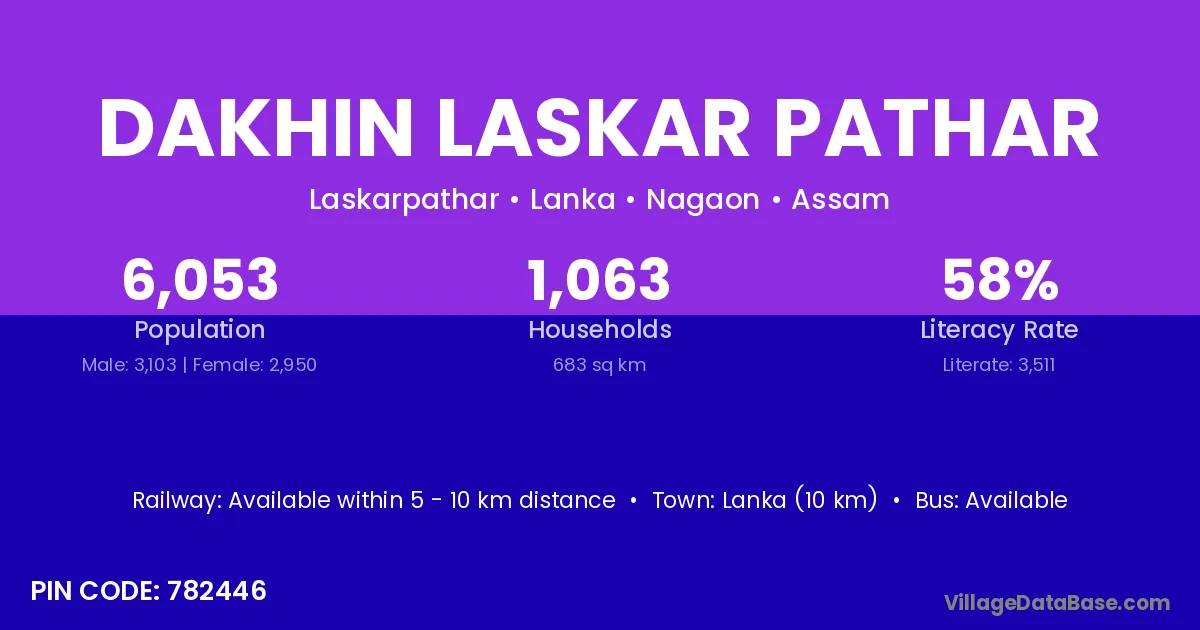 Lanka (10 km) is the nearest town to Dakhin Laskar Pathar village for major economic activities and is located approximately 10 km away.