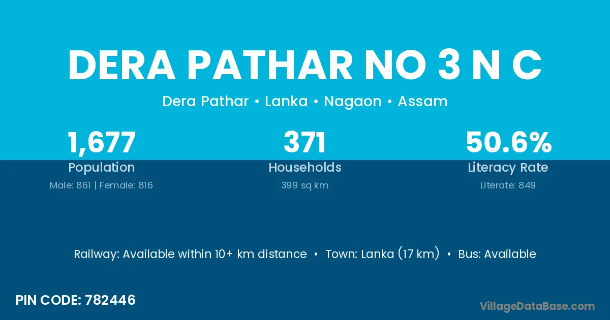 Lanka (17 km) is the nearest town to Dera Pathar No 3 N C village for major economic activities and is located approximately 17 km away.