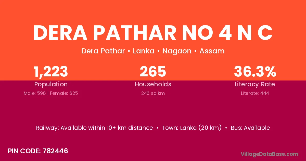 Lanka (20 km) is the nearest town to Dera Pathar No 4 N C village for major economic activities and is located approximately 20 km away.