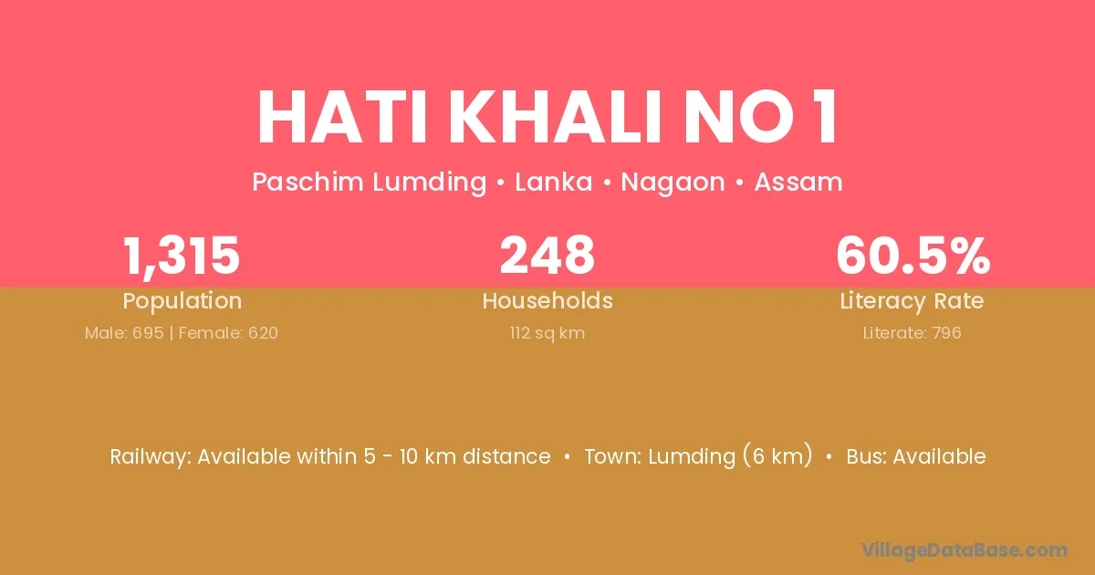 Lumding (6 km) is the nearest town to Hati Khali No 1 village for major economic activities and is located approximately 6 km away.