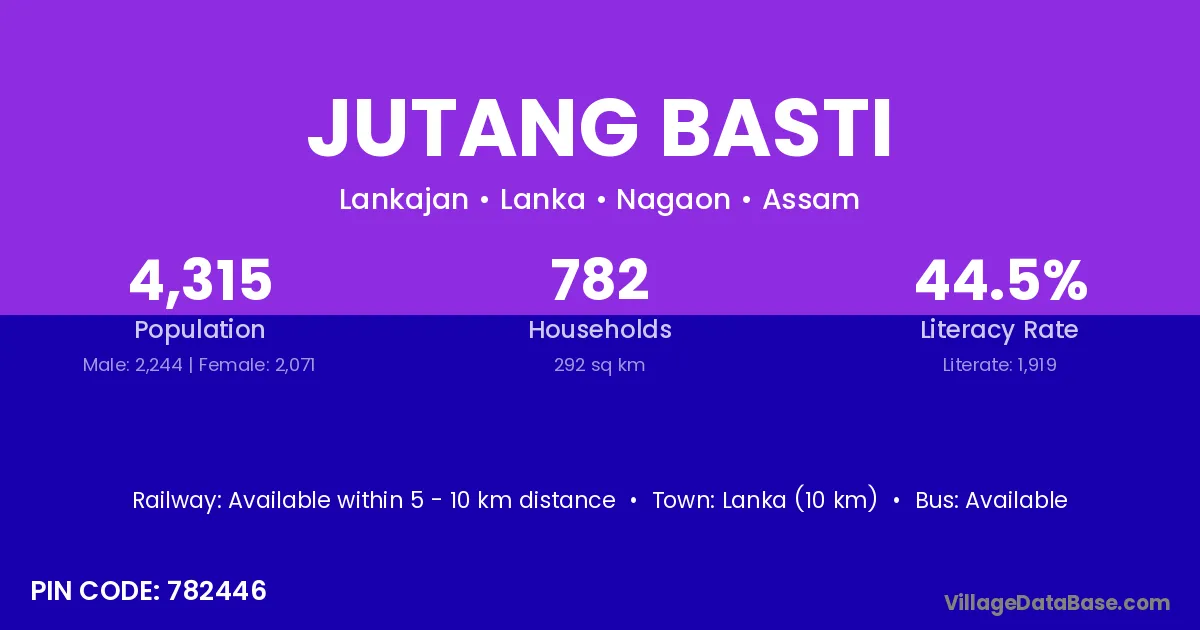 Lanka (10 km) is the nearest town to Jutang Basti village for major economic activities and is located approximately 10 km away.