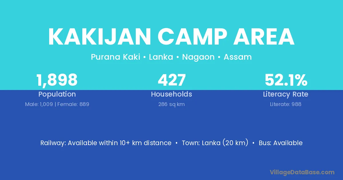 Lanka (20 km) is the nearest town to Kakijan Camp Area village for major economic activities and is located approximately 20 km away.