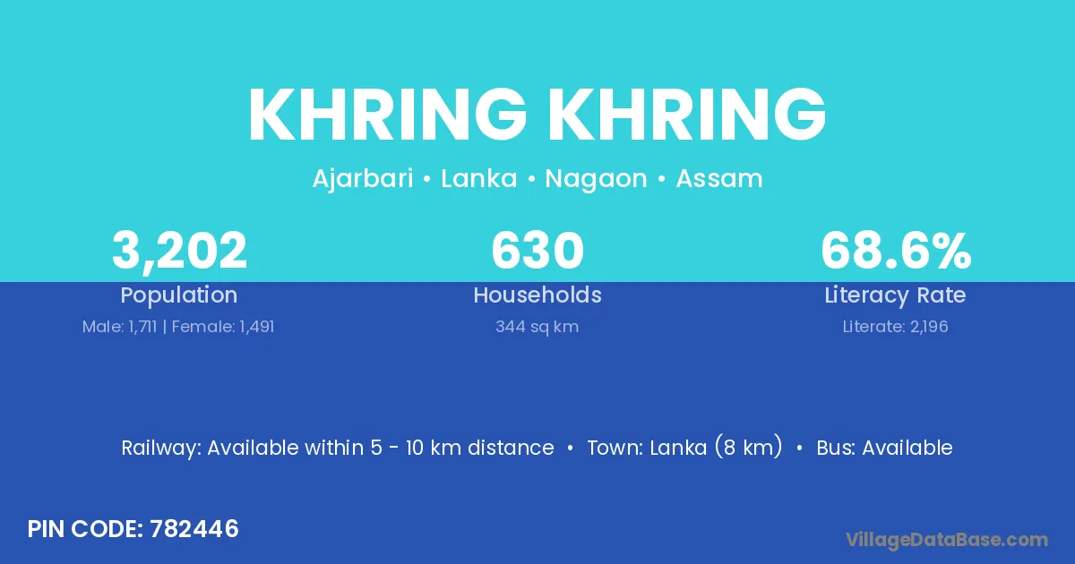 Khring Khring village has a total population of 3,202 people, of which 1,711 are males and 1,491 are females.
