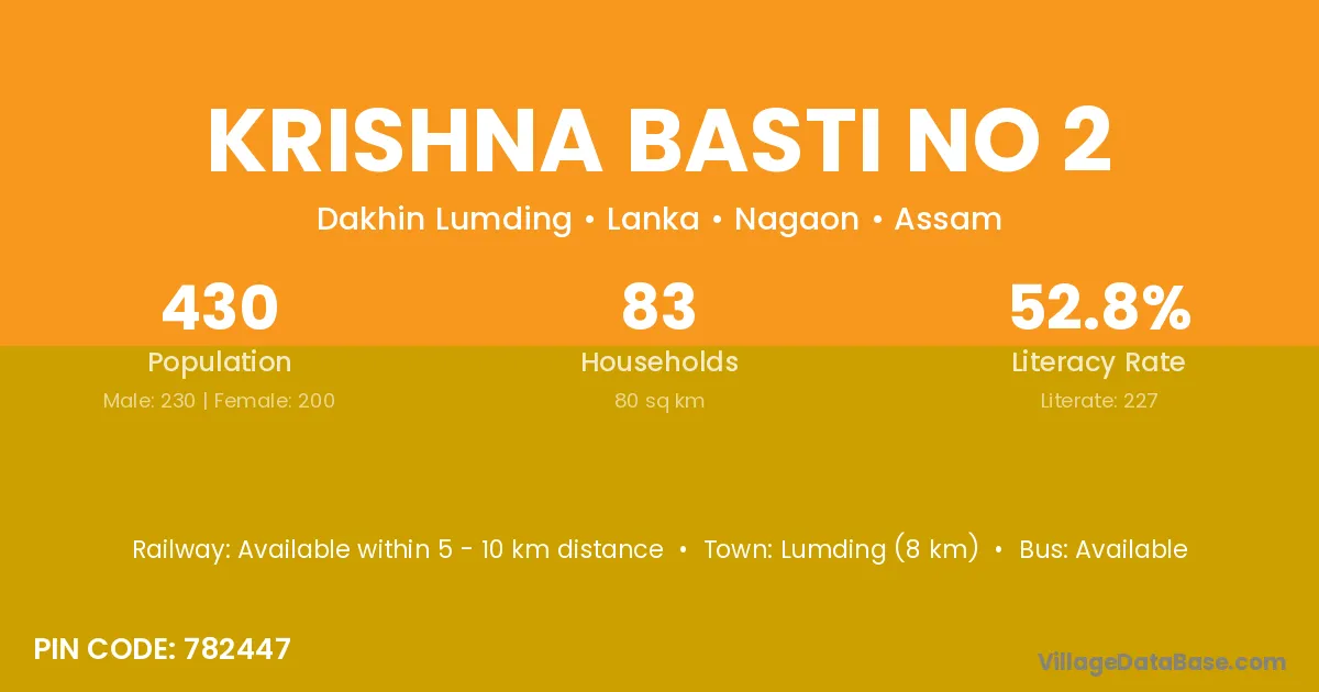 Lumding (8 km) is the nearest town to Krishna Basti No 2 village for major economic activities and is located approximately 8 km away.