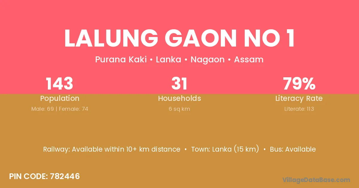 Lalung Gaon No 1 village has a total population of 143 people, of which 69 are males and 74 are females.