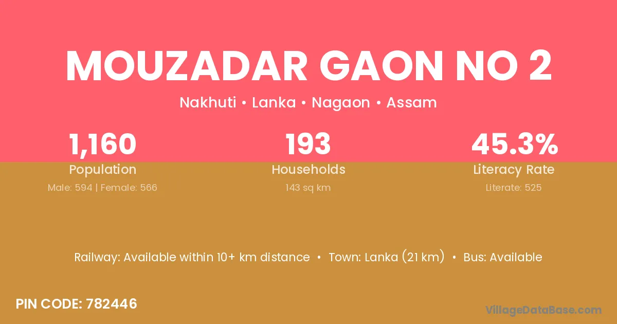 Lanka (21 km) is the nearest town to Mouzadar Gaon No 2 village for major economic activities and is located approximately 21 km away.