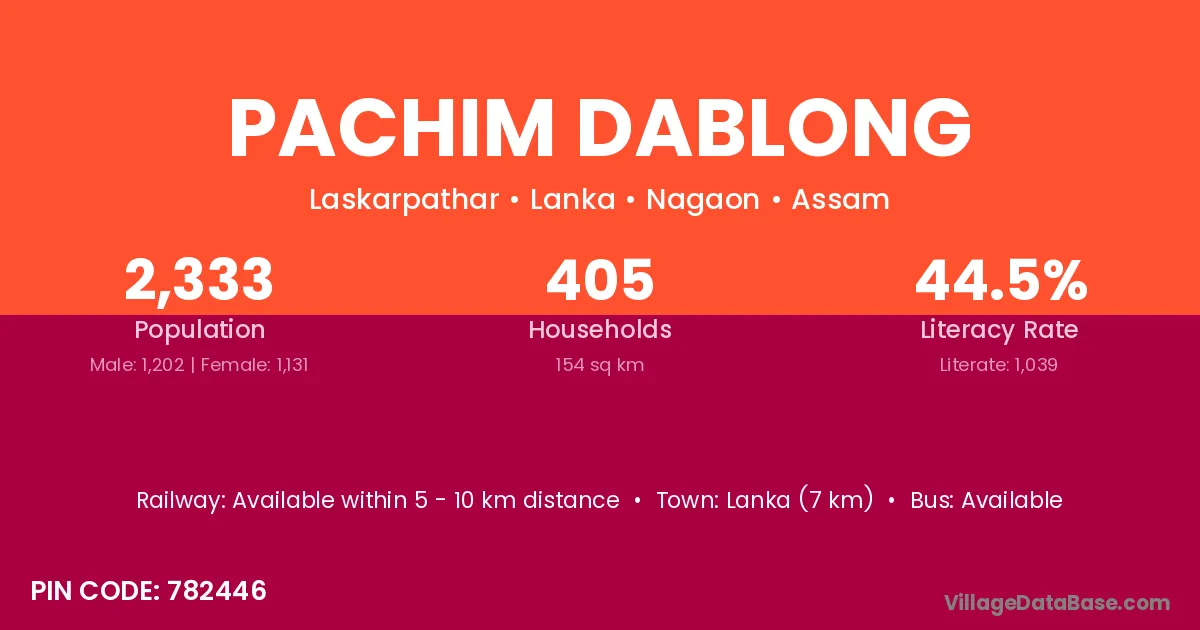 Lanka (7 km) is the nearest town to Pachim Dablong village for major economic activities and is located approximately 7 km away.
