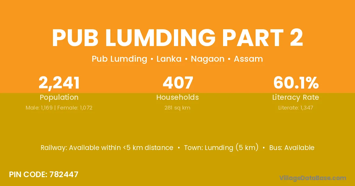 Lumding (5 km) is the nearest town to Pub Lumding Part 2 village for major economic activities and is located approximately 5 km away.