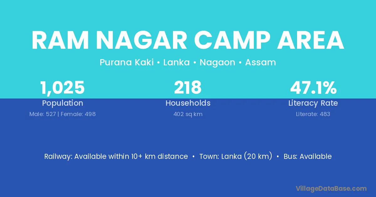 Lanka (20 km) is the nearest town to Ram Nagar Camp Area village for major economic activities and is located approximately 20 km away.
