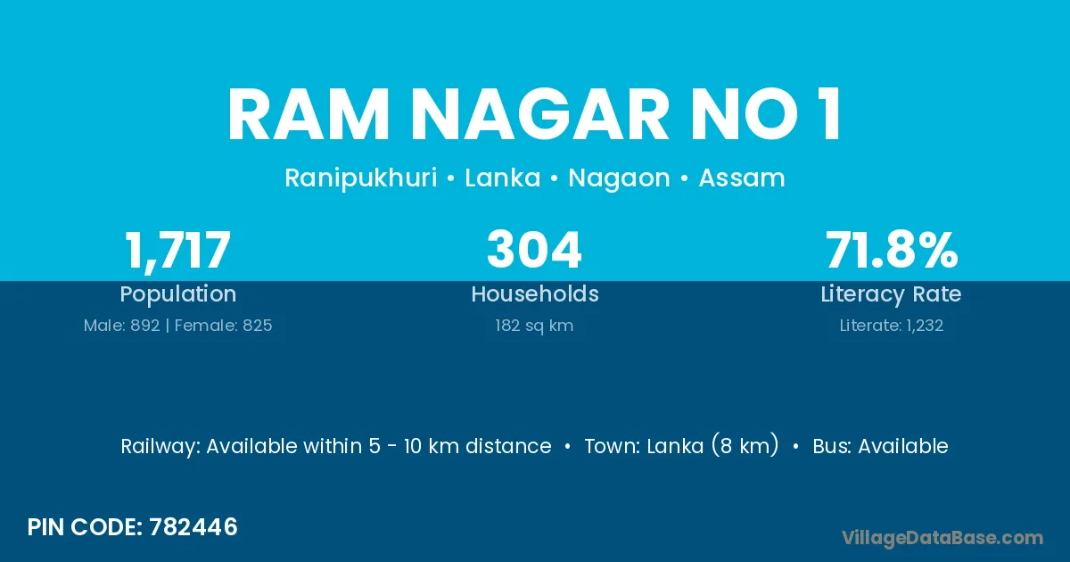 Lanka (8 km) is the nearest town to Ram Nagar No 1 village for major economic activities and is located approximately 8 km away.