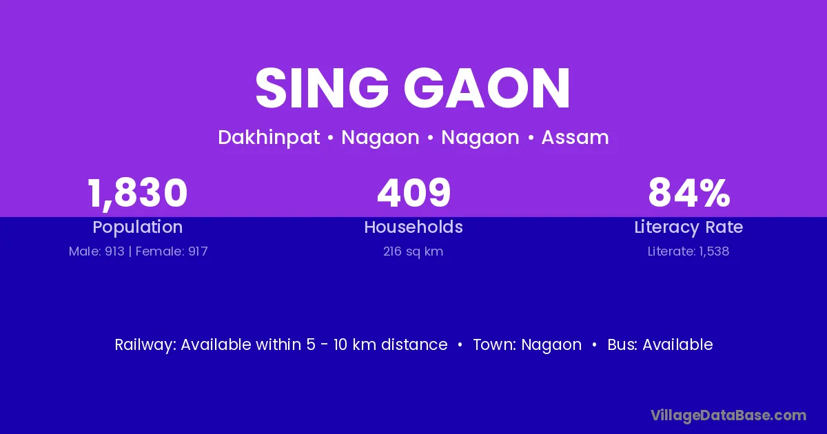 Sing Gaon village has a total population of 3,798 people, of which 1,923 are males and 1,875 are females.