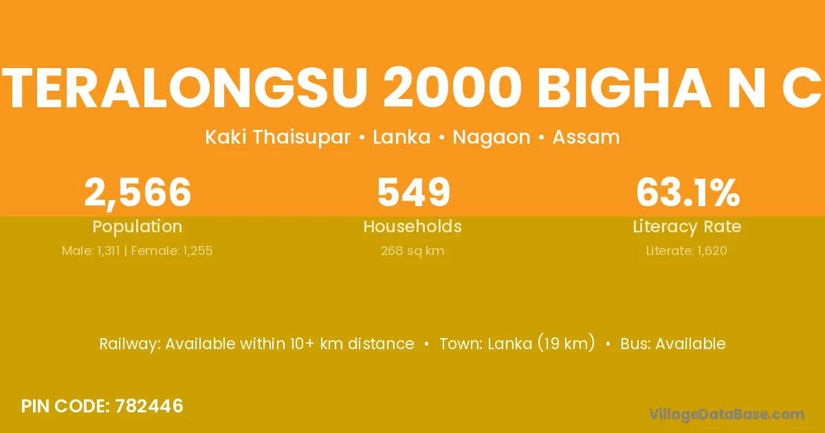 Lanka (19 km) is the nearest town to Teralongsu 2000 Bigha N C village for major economic activities and is located approximately 19 km away.
