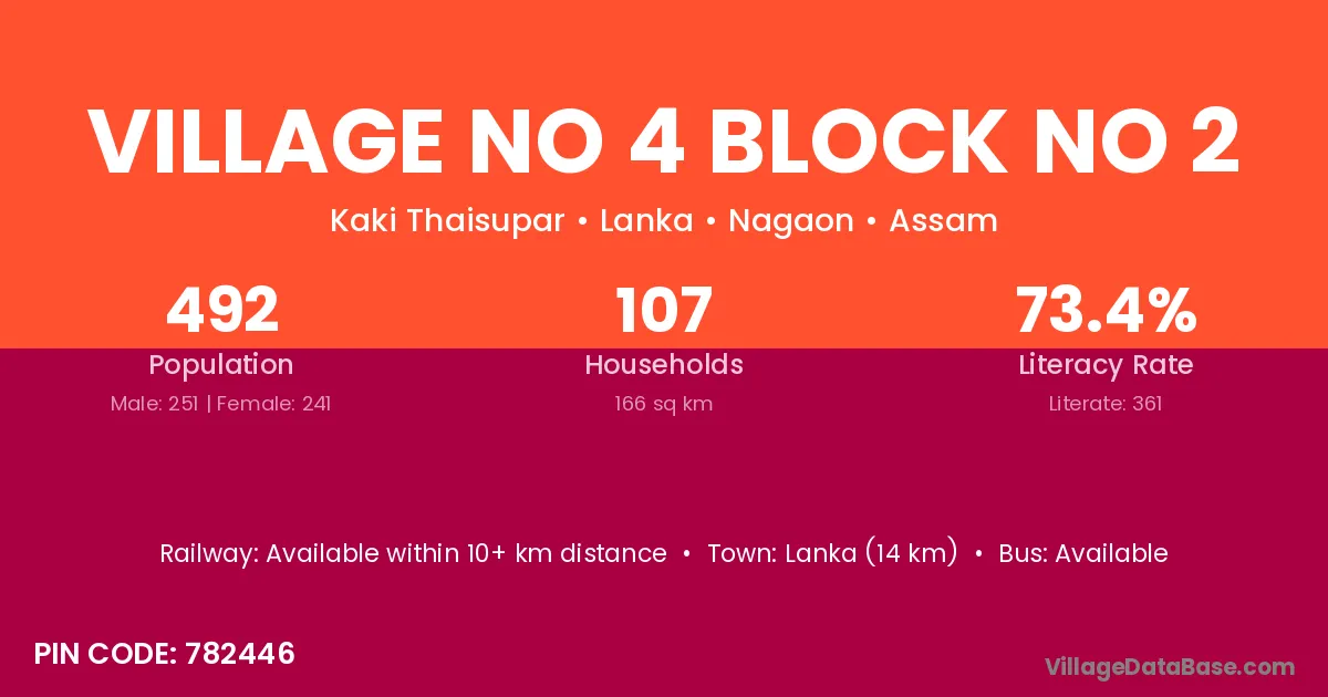 Village No 4 Block No 2 village is located in the Lanka Subdivision of the Nagaon district in Assam .
