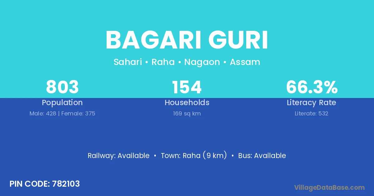 Raha (9 km) is the nearest town to Bagari Guri village for major economic activities and is located approximately 9 km away.