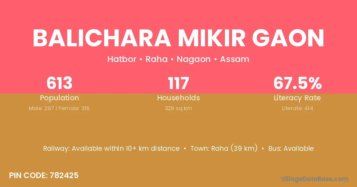 Balichara Mikir Gaon village has a total population of 613 people, of which 297 are males and 316 are females.