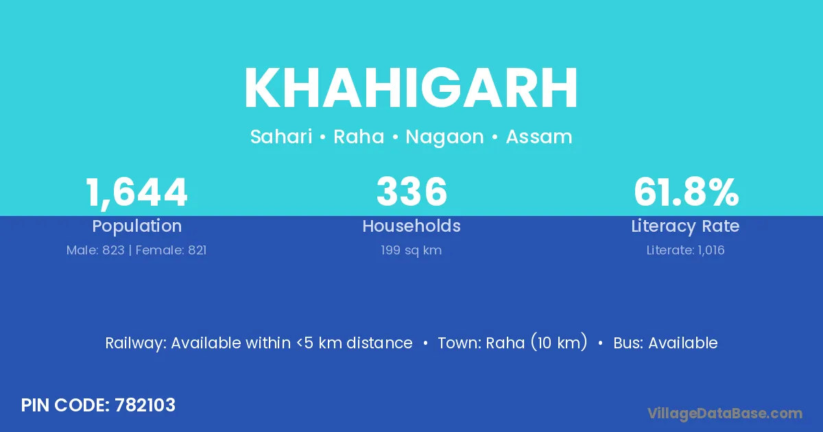Raha (10 km) is the nearest town to Khahigarh village for major economic activities and is located approximately 10 km away.