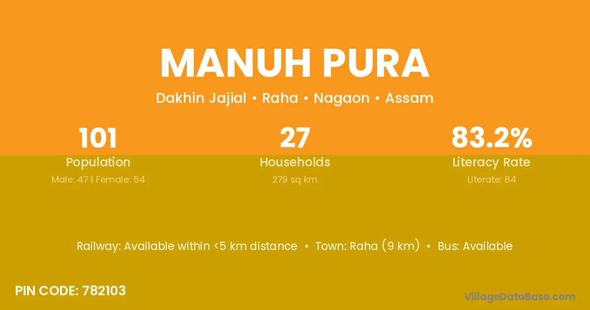 Raha (9 km) is the nearest town to Manuh Pura village for major economic activities and is located approximately 9 km away.