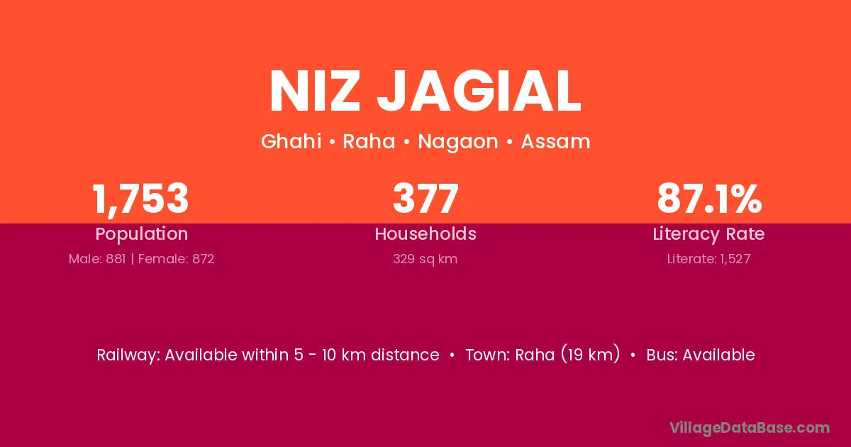 Raha (19 km) is the nearest town to Niz Jagial village for major economic activities and is located approximately 19 km away.
