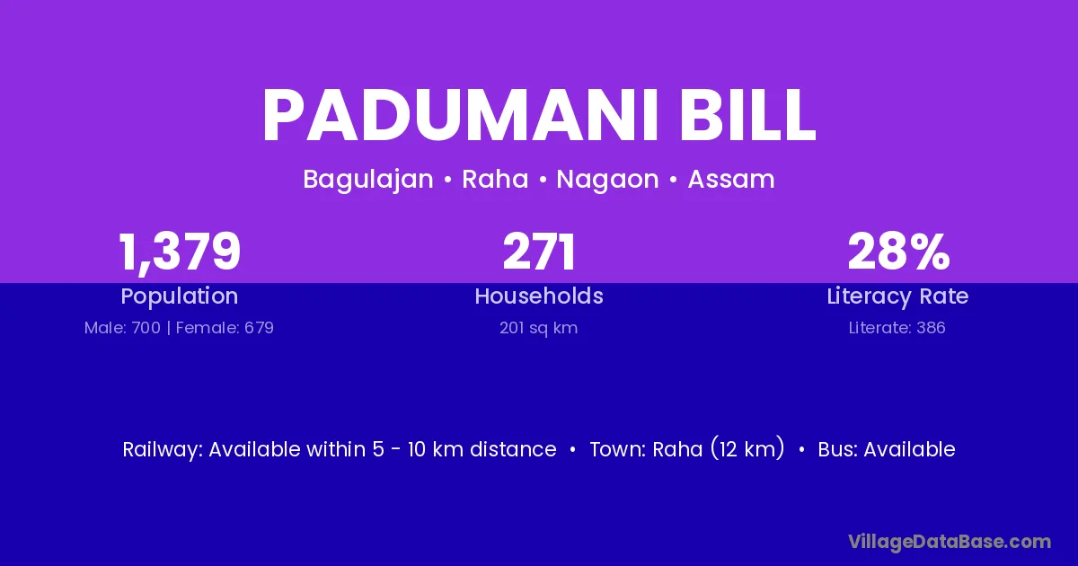 Raha (12 km) is the nearest town to Padumani Bill village for major economic activities and is located approximately 12 km away.