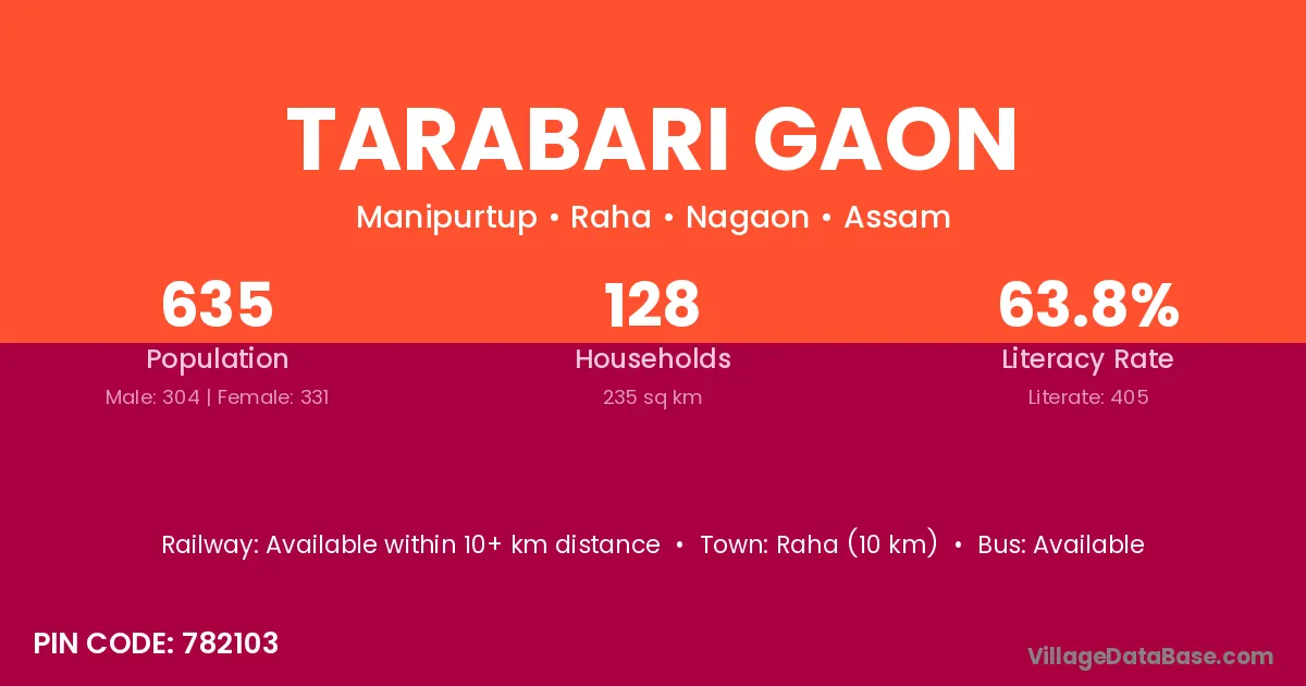 Tarabari Gaon village has a total population of 635 people, of which 304 are males and 331 are females.
