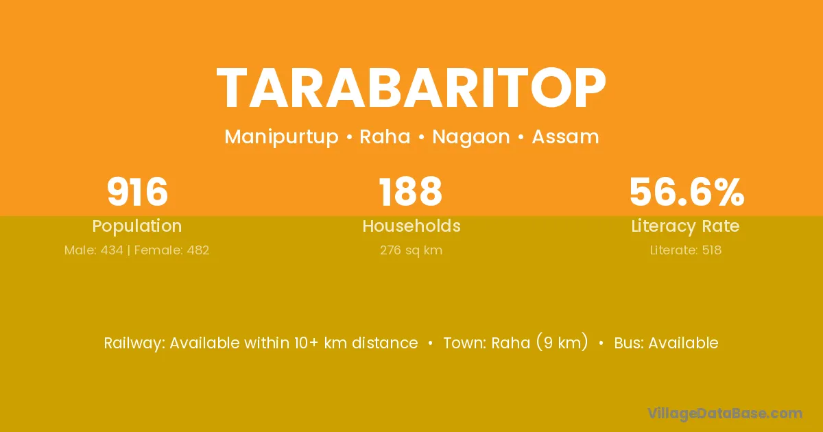 Raha (9 km) is the nearest town to Tarabaritop village for major economic activities and is located approximately 9 km away.
