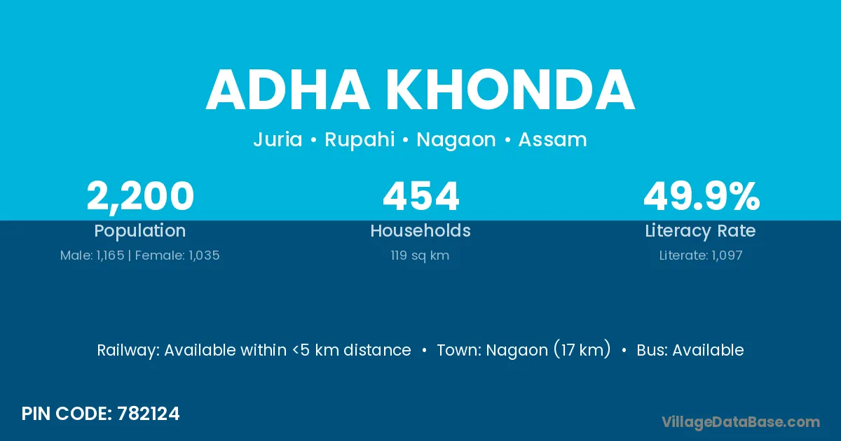 Nagaon (17 km) is the nearest town to Adha Khonda village for major economic activities and is located approximately 17 km away.