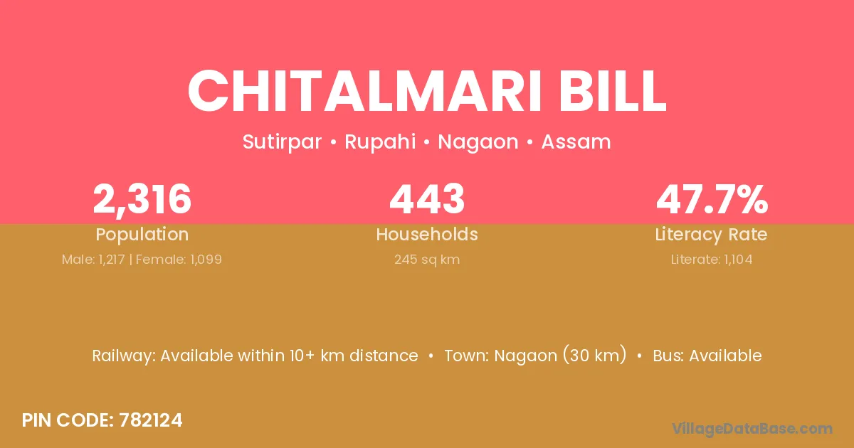 Nagaon (30 km) is the nearest town to Chitalmari Bill village for major economic activities and is located approximately 30 km away.