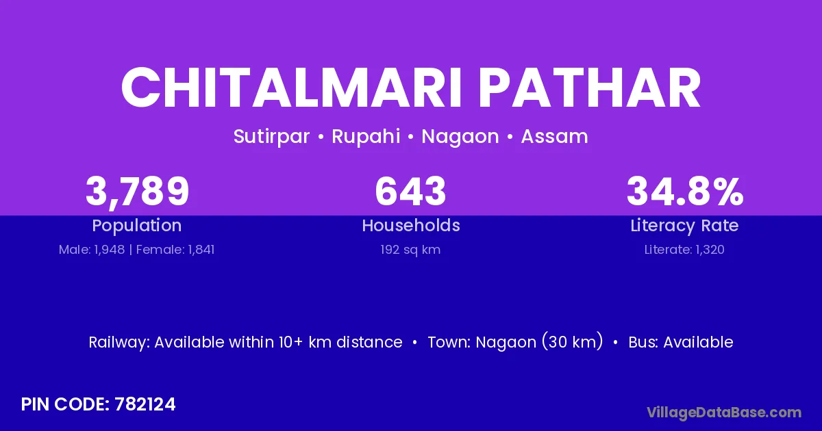 Nagaon (30 km) is the nearest town to Chitalmari Pathar village for major economic activities and is located approximately 30 km away.
